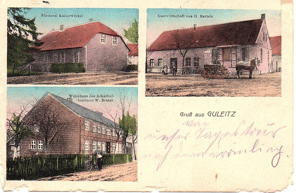 Die Ansichtskarte zeigt auf der Vorderseite drei kolorierte Fotografien von Gebäuden in Guleitz bzw. Kaiserwinkel: Zum einen die Försterei der Grafen v. d. Schulenburg Wolfsburg, das Wohnhaus des Ackerhofbesitzers W. Bratze, das heute noch fast genauso aussieht sowie die im Jahr 1899 gebaute Gastwirtschaft von H. Bartels an der Abzweigung nach Zicherie (heute Wiehle).