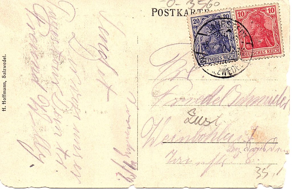 Von der Ortschaft Kaiserwinkel sind nicht allzu viele Postkarten bekannt. Die hier abgebildete Postkarte wurde mit Poststempel Jahrstedt am 5. Juli 1920 abgestempelt. Sie lief von Jahrstedt nach Weinböhla in Sachsen.