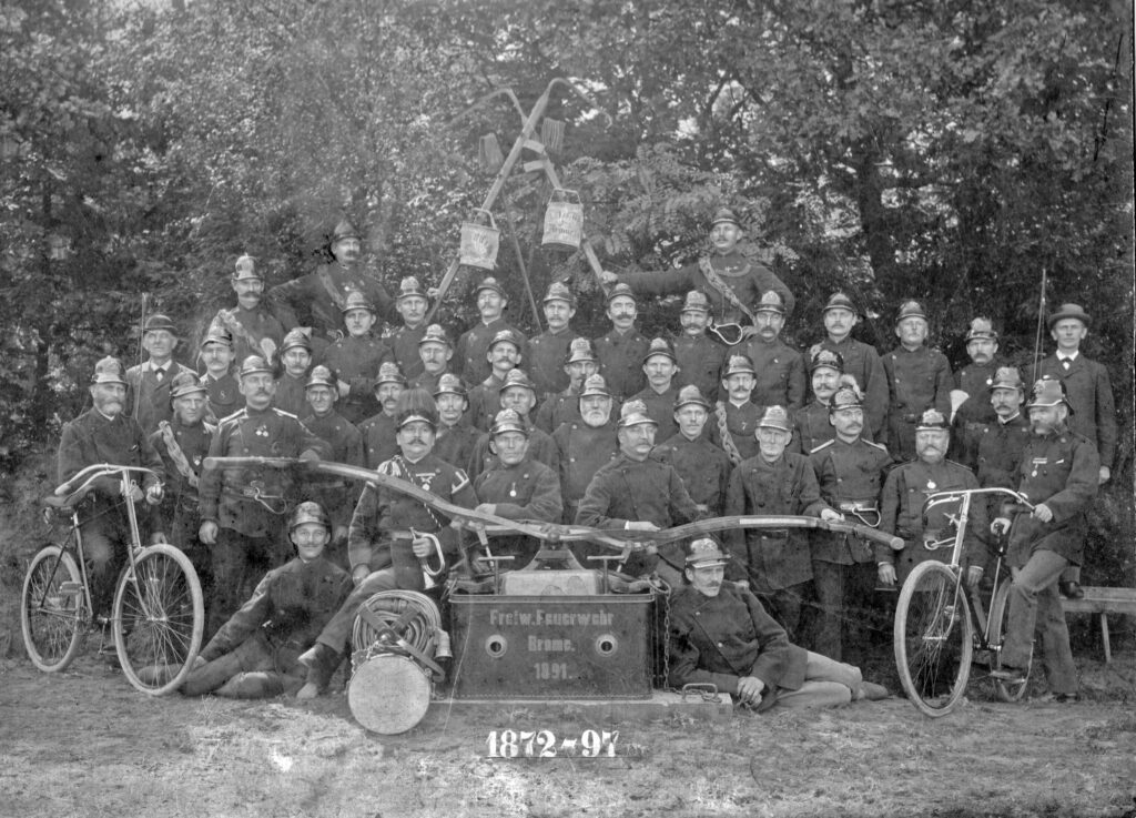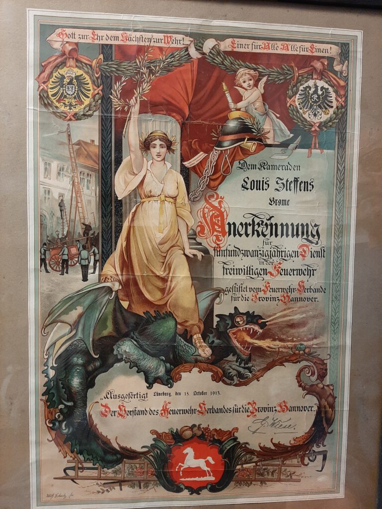 Interessant sind die Bilder an der Wand. Oben links hängt das gerahmte Gruppenfoto von 1897 zum 25jährigen Jubiläum der Freiwilligen Feuerwehr Brome, rechts daneben eine Urkunde über die Anerkennung für langjährigen Dienst (evtl. 25 Jahre) in der Freiwilligen Feuerwehr Brome ausgestellt vom Vorstand des Feuerwehrverbandes der Provinz Hannover.
