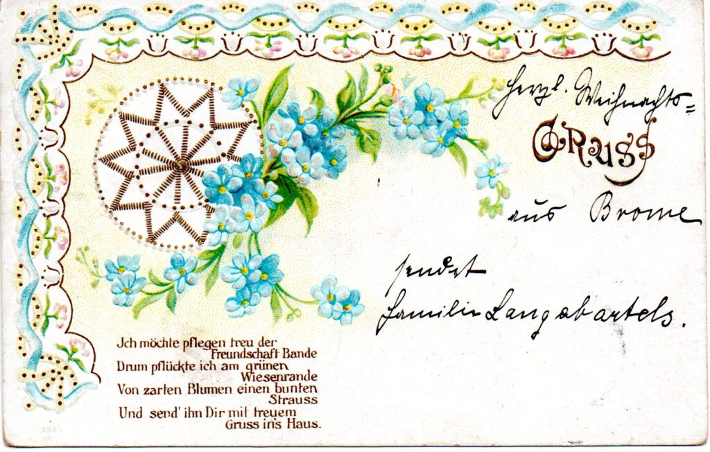 Eine kleine Postkarte, versandt vor über 120 Jahren, erzählt uns heute noch von den Bräuchen, der Familie und dem Leben in Brome um die Wende zum 20. Jahrhundert. Es handelt sich um eine Prägepostkarte, die die Familie Langebartels zur Weihnachtszeit 1902 an Fräulein Bertha von Oven in Aurich verschickte – ein stilles Zeugnis der Wertschätzung und der persönlichen Verbindungen zwischen den Bürgern unserer Region.