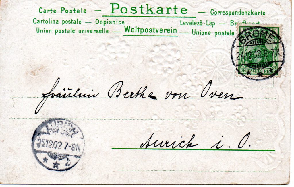 Mit Poststempel vom 24. Dezember 1902 in Brome aufgegeben, erreichte die Karte ihre Empfängerin in Aurich am 25. Dezember – ein flotter Versand für damalige Verhältnisse, der zeigt, wie zuverlässig der Postdienst bereits funktionierte. Dass die Karte aufbewahrt und weitergegeben wurde, macht sie zu einer wertvollen Quelle für Familiengeschichte und lokale Alltagskultur.