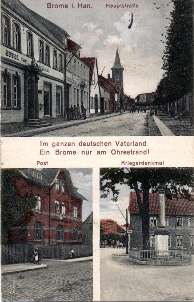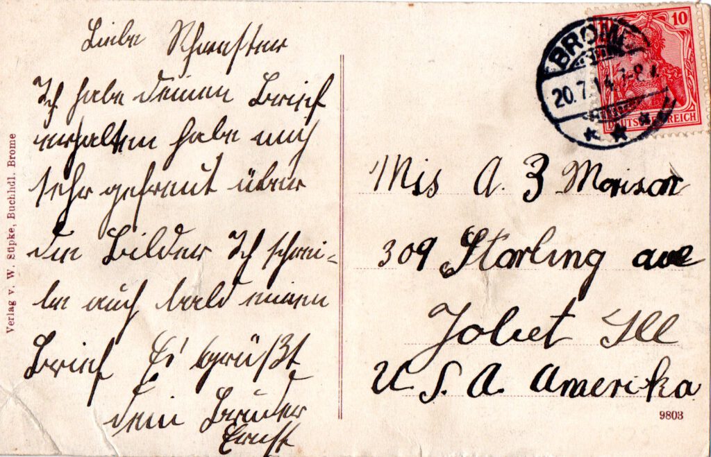 Mit dem Poststempel vom 20. Juli 1914 aus Brome (Niedersachsen) schickte ein gewisser Ernst eine Postkarte an seine Schwester nach Amerika. Die Adresse lautete: 309 Starling Avenue, Joliet, Illinois, USA.