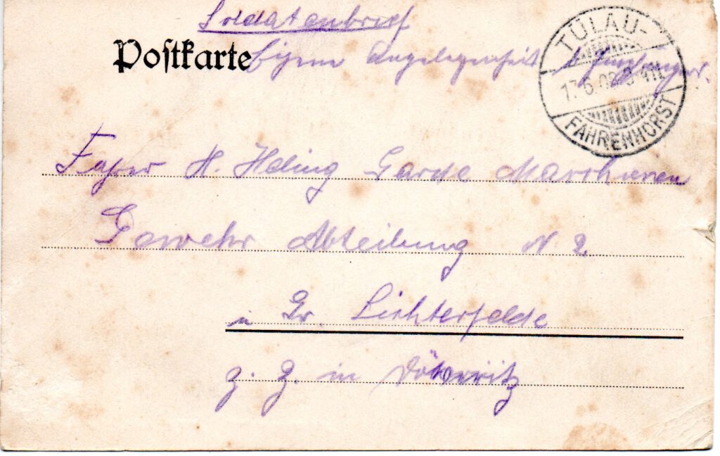 Am 17. Juni 1908 schrieb Heinrich Heling (Altendorf) aus Tülau eine Postkarte an seinen Bruder Hermann Heling, der seinerzeit Soldat bei der Garde Maschinengewehr Abteilung Nr. 2 in Gr. Lichterfelde war. Er hielt sich wohl damals auf dem Truppenübungsplatz Döberitz auf, wie der Zusatz z.Z. in Döberitz vermuten lässt.
