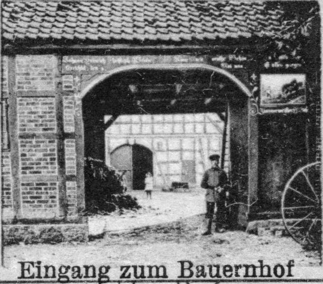 Aus den Aufzeichnungen von Schülern der Wiswedeler Schule geht hervor, dass am Haus der Familie Behne, welches hinter der obigen Toreinfahrt lag und heute nicht mehr existiert, folgende Inschrift gestanden hat:
